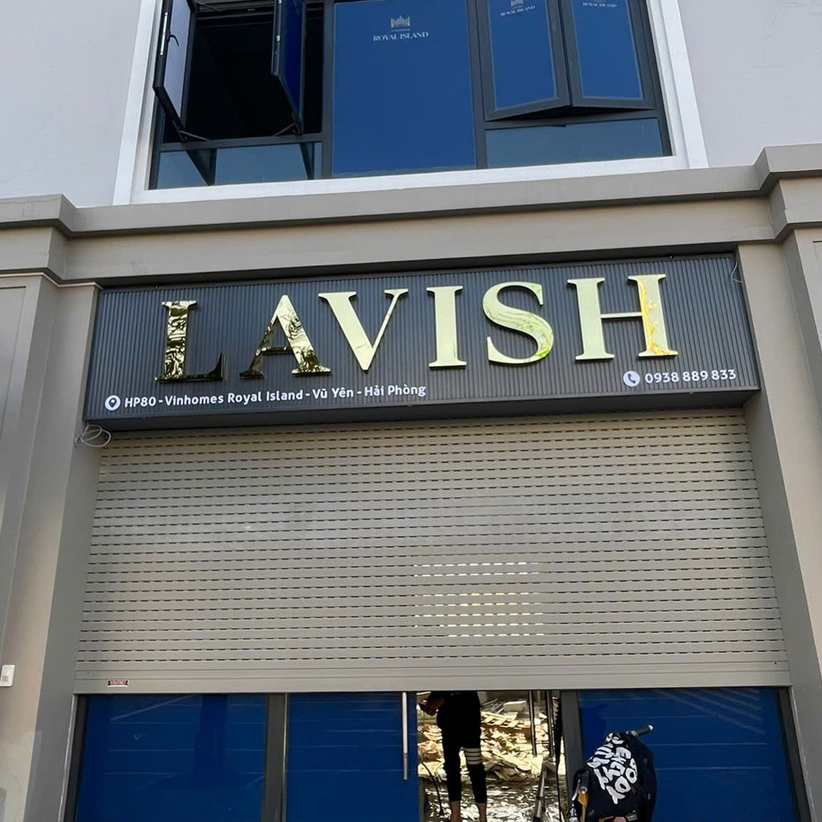 Biển hiệu chính được thi công với chữ nổi LAVISH sử dụng đèn LED, kết hợp kỹ thuật hắt sáng tông vàng phía sau chữ. Giải pháp này giúp: